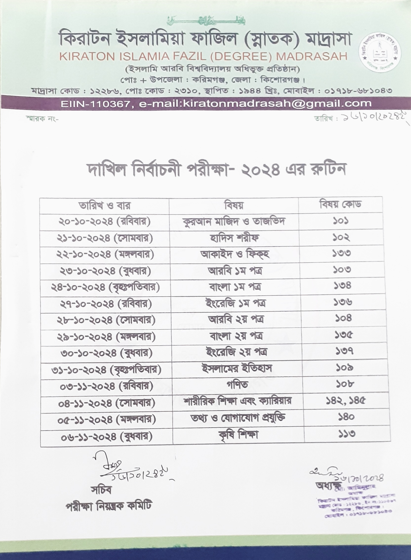 শিরোনাম : দাখিল ১০ম শ্রেণি নির্বাচনী পরীক্ষার রুটিন-২০২৪ইং